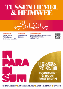 Op vrijdag 12 december is ons eerste ‘In Paradisum’-programma van een serie van vier. Onder de titel ‘Tussen hemel en heimwee’ zingen we westerse en Arabische liederen met Orkest ABG en met Majed Saraydeen en andere Arabische musici.